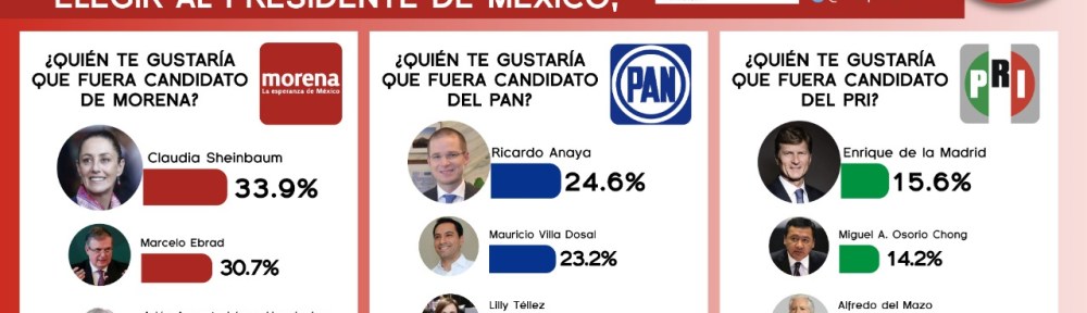 Entre los principales candidatos del Partido Acción Nacional, se encuentra el ex Diputado de Querétaro, Ricardo Anaya Cortés, quien obtuvo 24.6%; le sigue el Gobernador de Yucatán, Mauricio Vila Dosal, con un 23.2%; la Senadora Lilly Téllez, con un 11.8%; el Gobernador de Tamaulipas, Francisco García Cabeza de Vaca, con u 11.4%; Diego Sinhue, con un 9.6%; Francisco Domínguez, con un 8.4%; Santiago Creel, con un 4.1% y el 6.9% en otro.