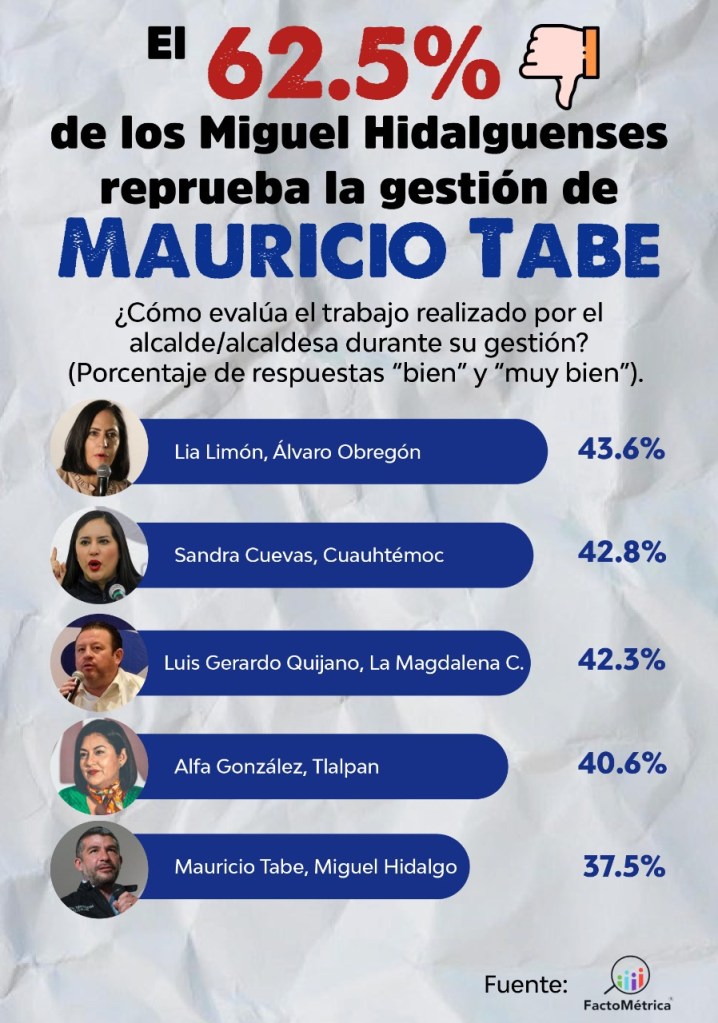 •Mauricio Tabe, alcalde de Miguel Hidalgo, registró un 37.5% de aprobación.