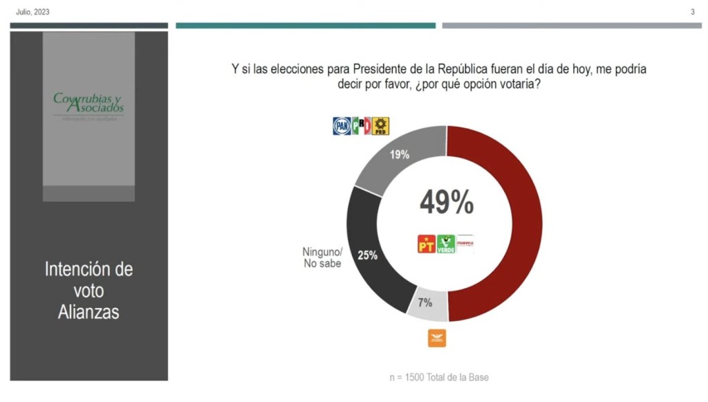 - Encuesta de Covarrubias: Los resultados señalaron que un 49% de los encuestados manifestó su preferencia por la coalición Morena-Verde-PT. En contraste, la coalición PAN-PRI-PRD obtuvo un 19% de preferencia, mientras que Movimiento Ciudadano (MC) alcanzó un 7%.