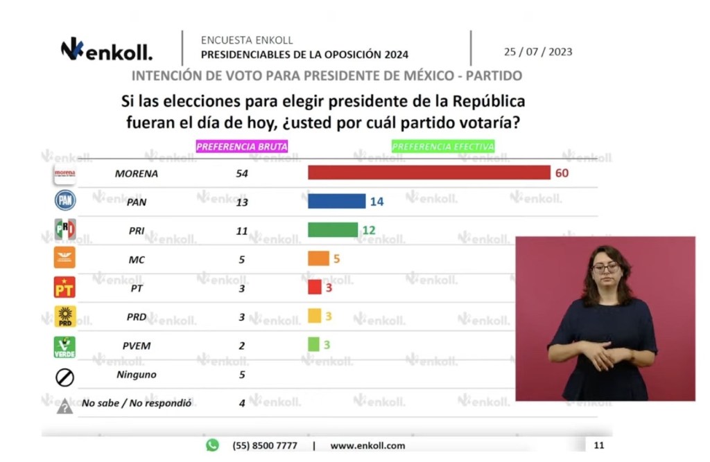 - Encuesta de Enkoll: Según estos resultados, la preferencia bruta para Morena alcanza un 54%, mientras que su preferencia efectiva se sitúa en el 60%. Por su parte, la coalición PAN-PRI-PRD obtuvo una preferencia bruta de 13%, con una preferencia efectiva del 14%. El PRI alcanzó un 11% de preferencia bruta y 12% de preferencia efectiva. Movimiento Ciudadano (MC) y el Partido del Trabajo (PT) obtuvieron un 5% de preferencia bruta y efectiva, respectivamente, mientras que el PRD y el Partido Verde se ubicaron en un 3% de preferencia bruta y efectiva. Un 5% de los encuestados manifestó que no votaría por ningún partido, y un 4% no respondió.