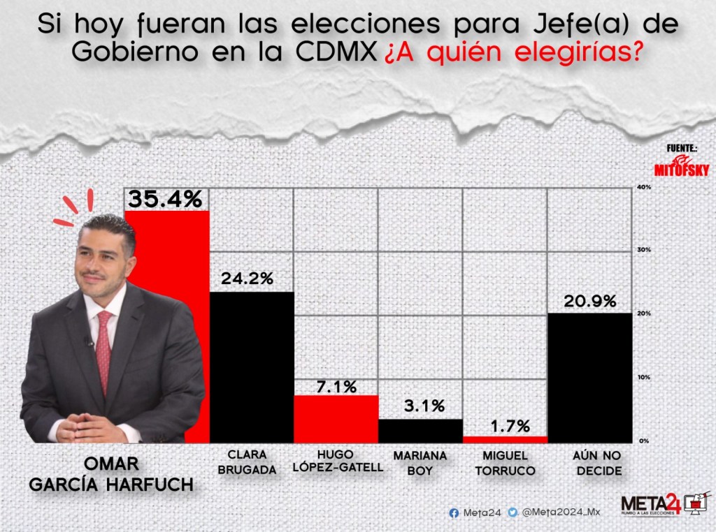Dentro de la contienda de Morena para definir al candidato que competirá por la Jefatura de Gobierno, Omar García Harfuch lidera con un sólido 35.4% de preferencias. Le sigue Clara Brugada con un 24.2%. Esto posiciona a García Harfuch con una ventaja de 11.2%, consolidándose como el candidato con el mayor apoyo en el partido Morena. Hugo López-Gatell obtuvo un 7.1%, Mariana Boy un 3.1%, y Miguel Torruco un 1.7%. El 20.9% de los encuestados indicó que no prefería a ninguno, y un 7.6% no respondió.