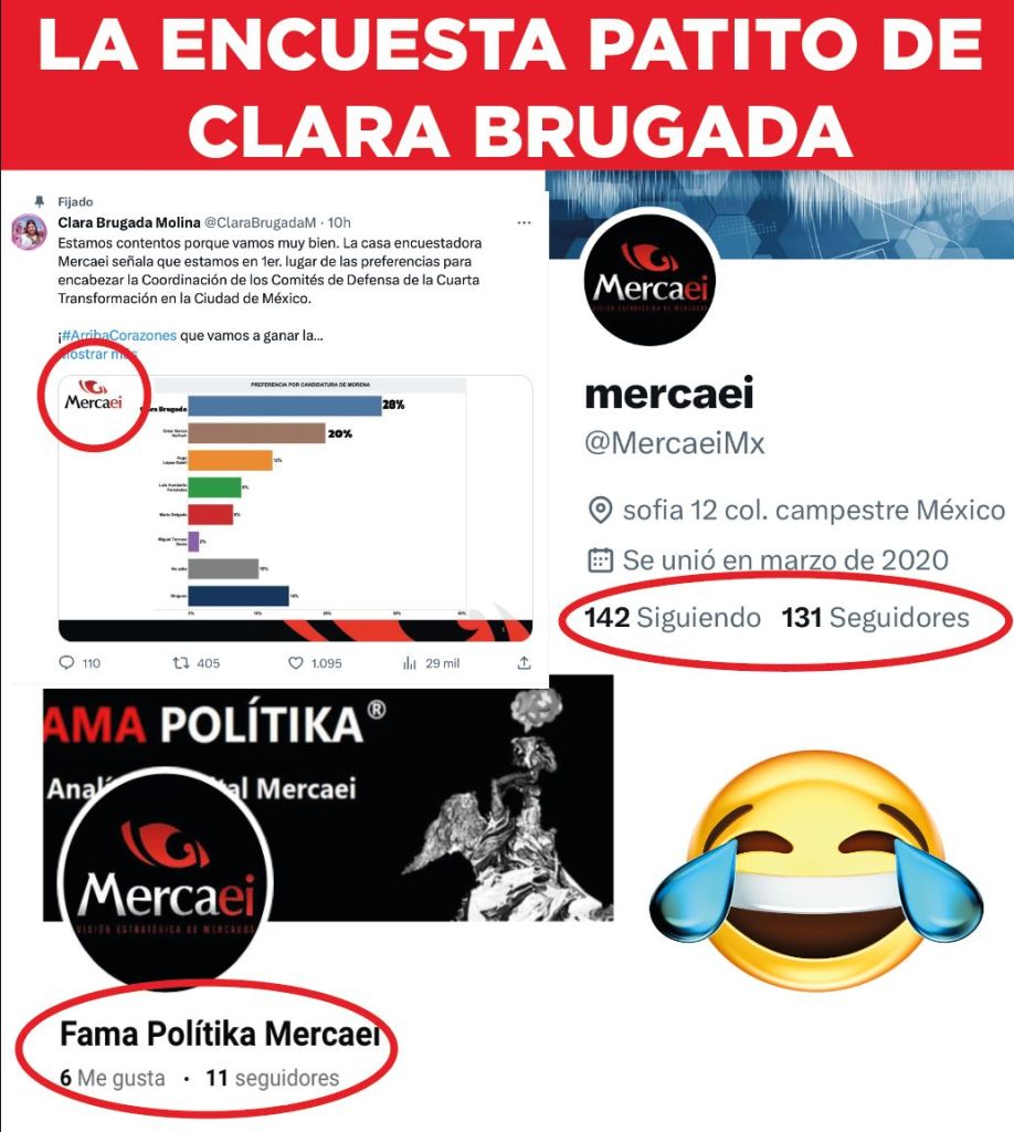 A través de sus redes sociales, Clara Brugada causó revuelo al publicar una encuesta de la empresa «Mercaei», que la ubica en el primer lugar de las preferencias para encabezar la Coordinación de los Comités de Defensa de la Cuarta Transformación en la Ciudad de México. Sin embargo, esta encuesta ha generado dudas debido a varias incoherencias en su información.